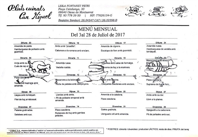 Menu Casal Juliol 2017 Recordeu que el preu de menjador esporàdic és de 7.8 € diaris, que s’hauran de pagar en efectiu el mateix dia que s’utilitzi el servei.Telèfons de contacte: Alba Moya 630 75 89 64 - Montse Campos 678 32 45 28