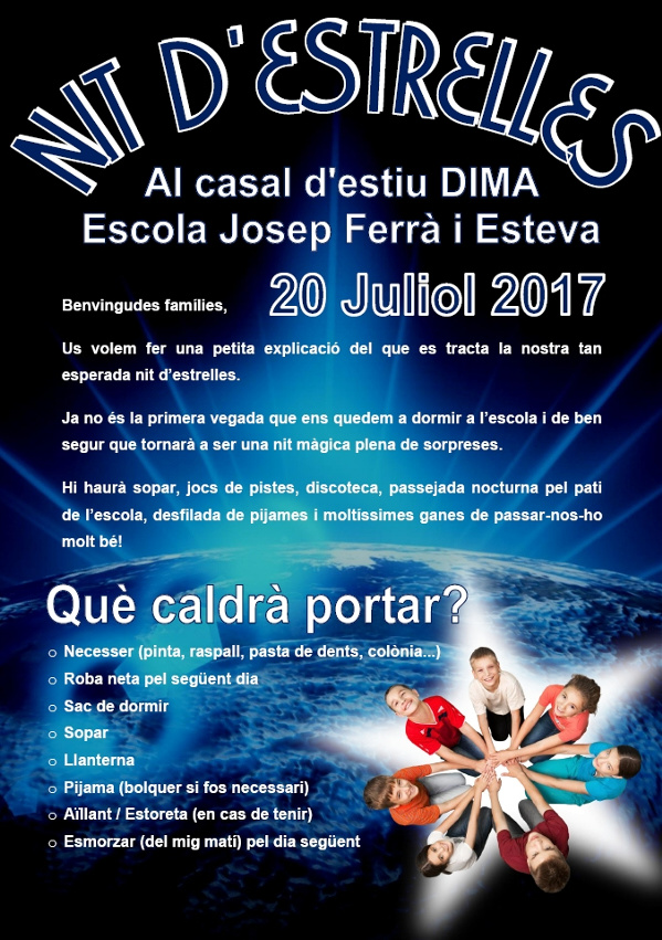 Nit de les Estrelles 20 Juliol del 2017 TORNAR A L'ÍNDEX DE VÍDEOS Vídeo nit d'Estrelles 20 de Juliol Casal d'Estiu Dima Ferrà 2017